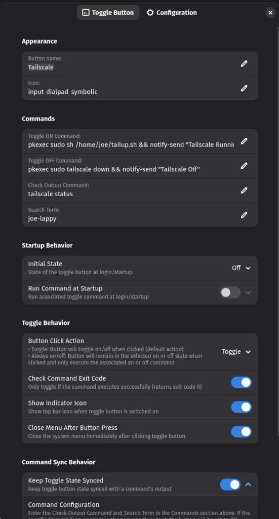 and some more fuck around and find out….been trying to find a good way to execute tailscale and have feedback in the gnome panel indicating on/off state and the ability to toggle.